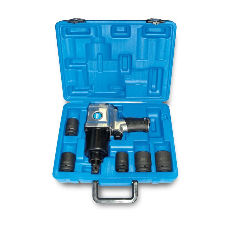 Kit avvitatore ad impulsi 3/4" MOD. 464 K in valigetta, a doppia massa battente. Dotato di regolatore di potenza a 3 livelli in avvitamento e scarico dell'aria nell'impugnatura. Completo di bussole 3/4" x 24-27-30-32-33 mm.